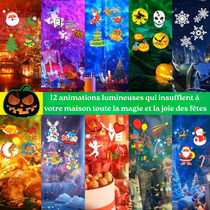 - 12 cartes de projection Ă effets multiples â chute de neige, vagues lumineuses colorĂ©es et motifs festifs variĂ©s